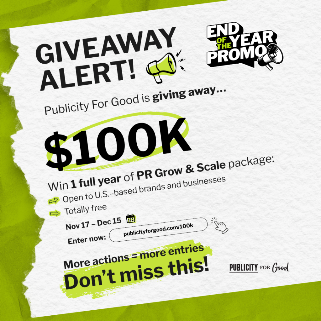 NASHVILLE, Tenn., (Nov. 5, 2025) — Publicity For Good (PFG), the #1 communications and PR agency for purpose-driven brands, is giving away a full year of public relations services valued at $100,000. This initiative will support one growing mission-driven business with the visibility, credibility, and storytelling power it needs to scale in 2026.